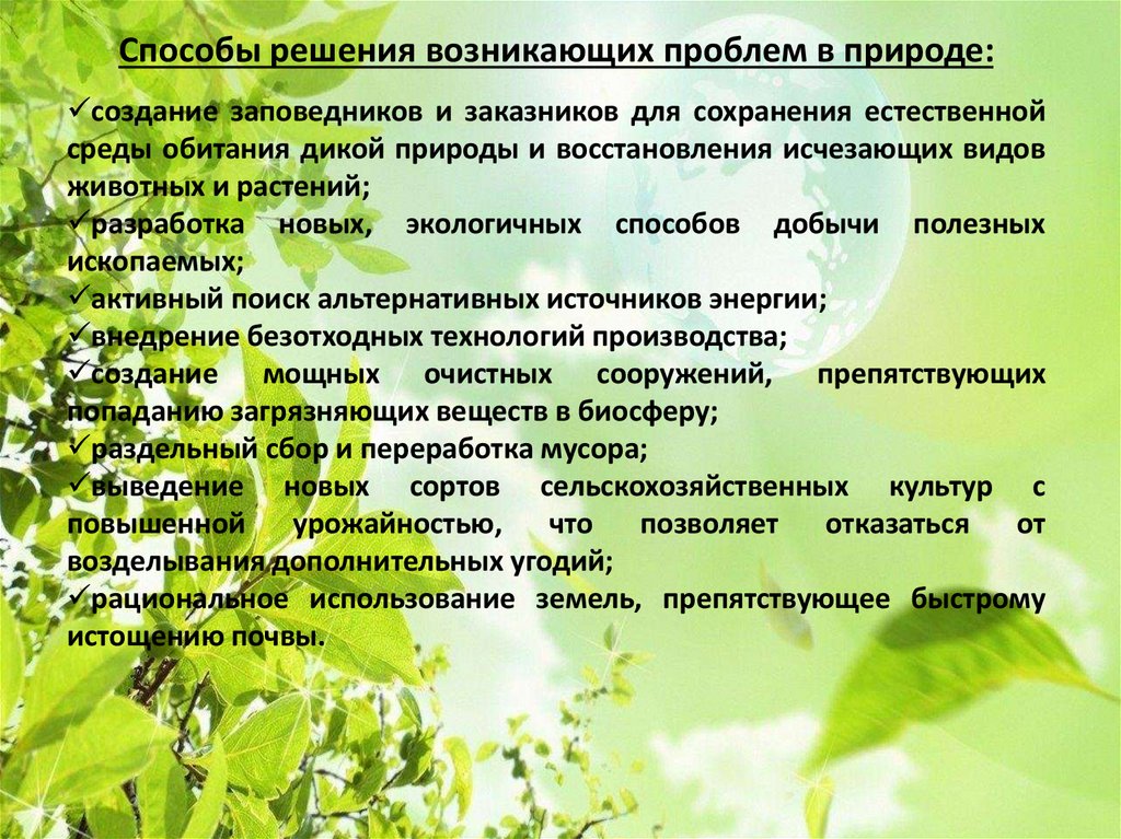 Способы решения возникающих проблем в природе:создание заповедников и заказников для сохранения естественной
