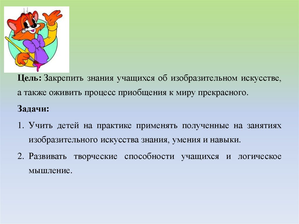 Цель: Закрепить знания учащихся об изобразительном искусстве,а также оживить процесс приобщения к миру прекрасного.