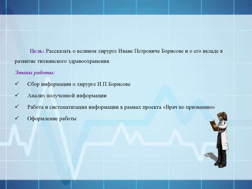 Цель: Рассказать о великом хирурге Иване Петровиче Борисове и о его вкладе вразвитие тихвинского здравоохранения.