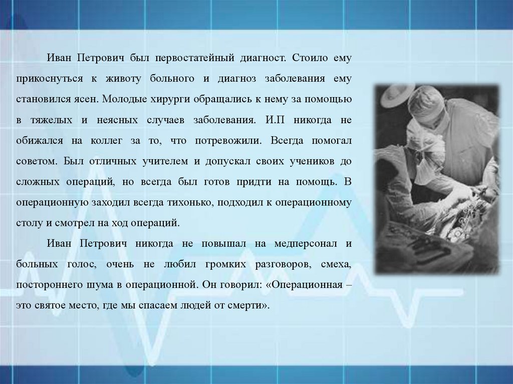Иван Петрович был хирургом по призванию, благодаря этому он добился успехов и