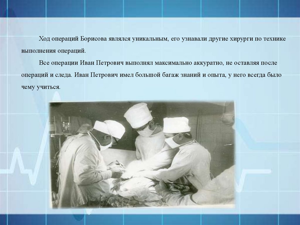 Ход операций Борисова являлся уникальным, его узнавали другие хирурги по техникевыполнения операций.