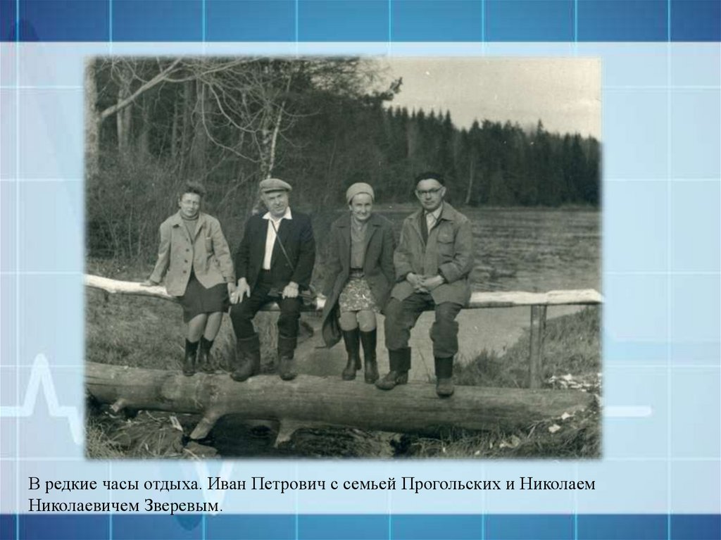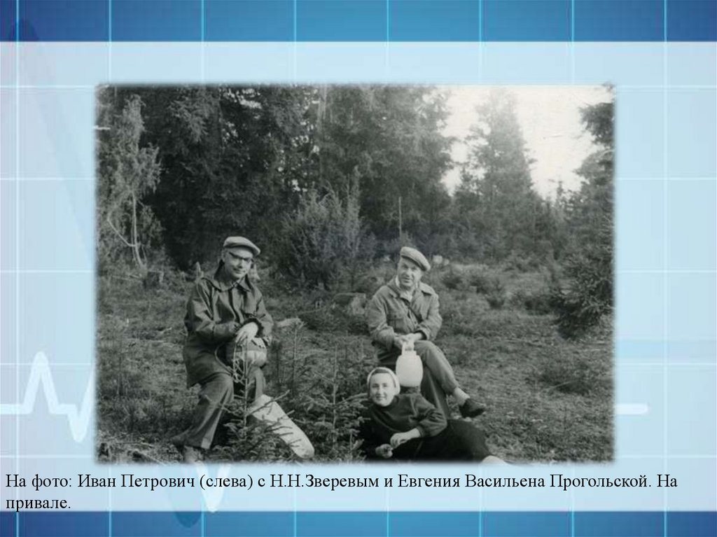 На фото: Иван Петрович (слева) с Н.Н.Зверевым и Евгения Васильена Прогольской. Напривале.