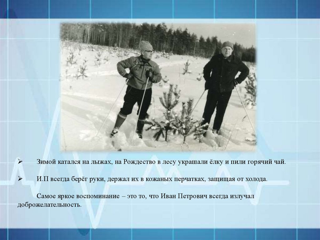 Зимой катался на лыжах, на Рождество в лесу украшали ёлку и пили горячий чай.И.П всегда берёг руки, держал их в кожаных перчатках, защищая от холода.