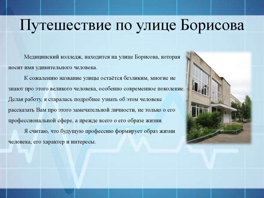 Путешествие по улице БорисоваМедицинский колледж, находится на улице Борисова, которая