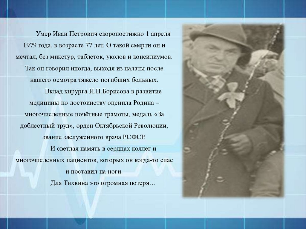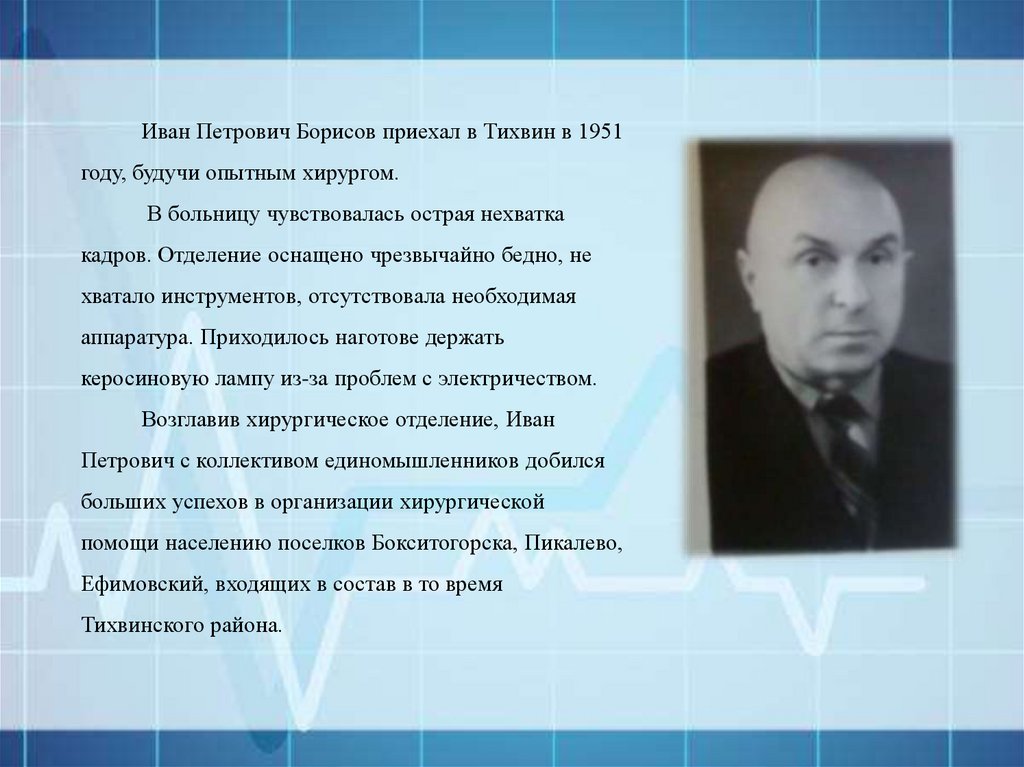Иван Петрович Борисов приехал в Тихвин в 1951году, будучи опытным хирургом.