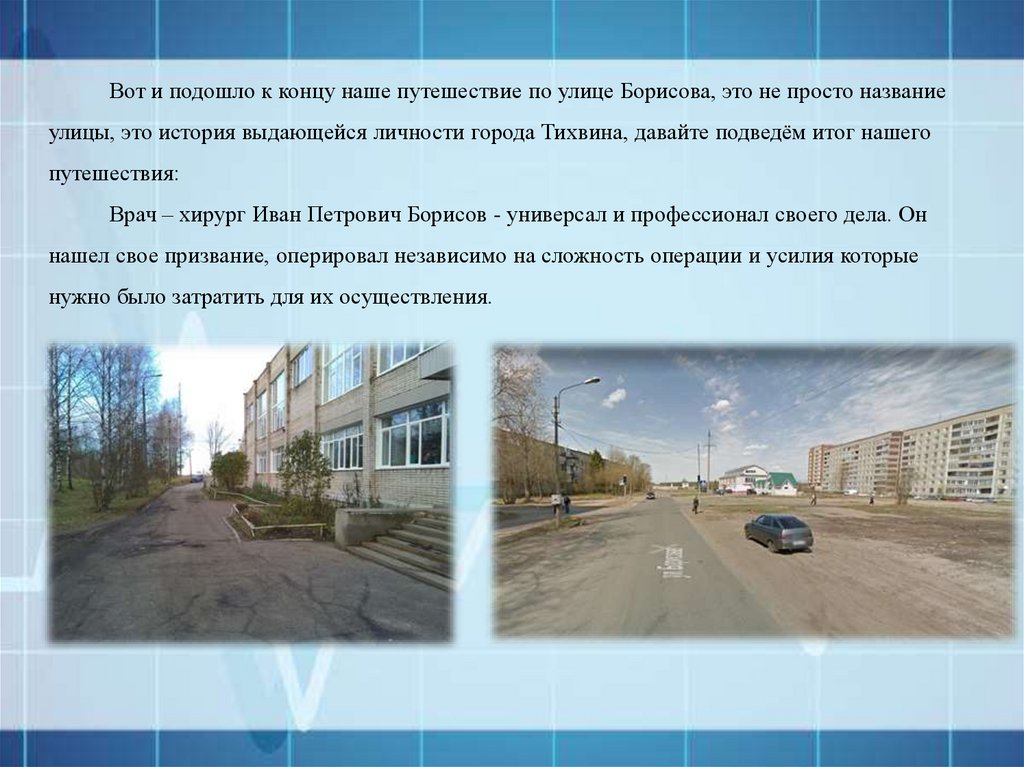 Вот и подошло к концу наше путешествие по улице Борисова, это не просто названиеулицы, это история выдающейся личности города Тихвина, давайте подведём итог нашего