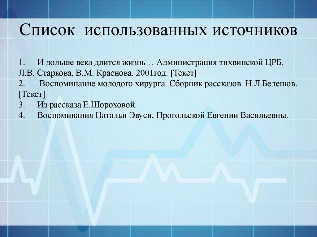 Список использованных источников1. И дольше века длится жизнь… Администрация тихвинской ЦРБ,