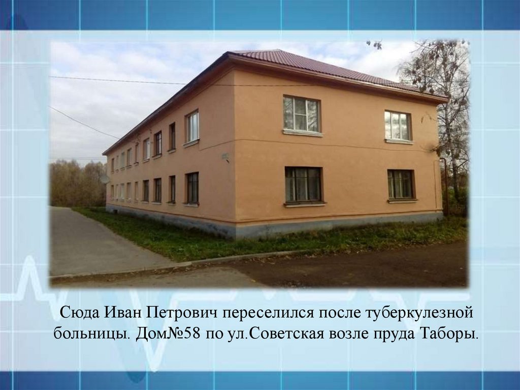 Сюда Иван Петрович переселился после туберкулезнойбольницы. Дом№58 по ул.Советская возле пруда Таборы.