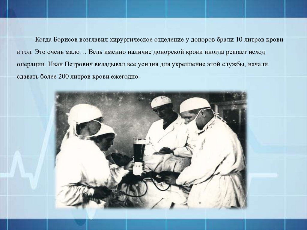 Когда Борисов возглавил хирургическое отделение у доноров брали 10 литров кровив год. Это очень мало… Ведь именно наличие донорской крови иногда решает исход
