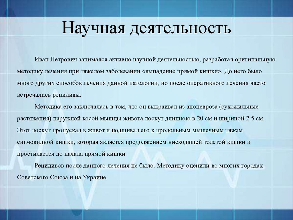 Научная деятельностьИван Петрович занимался активно научной деятельностью, разработал оригинальную