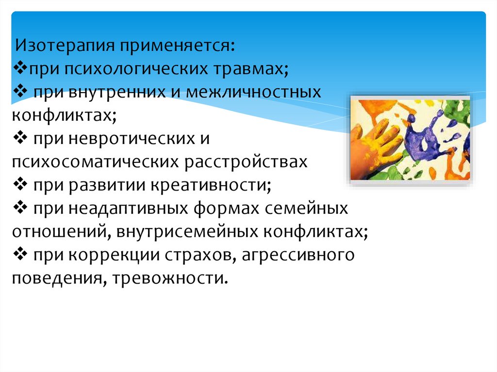 Изотерапия применяется:при психологических травмах;