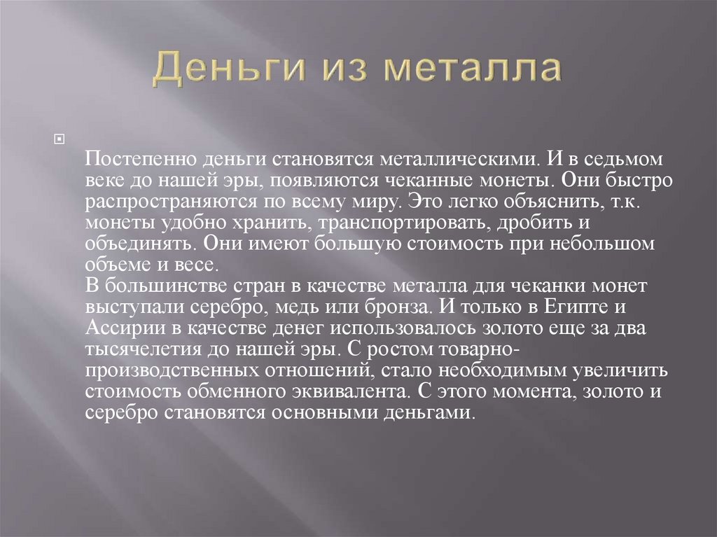 Постепенно деньги становятся металлическими. И в седьмомвеке до нашей эры, появляются чеканные монеты. Они быстро