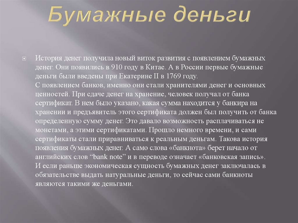 История денег получила новый виток развития с появлением бумажныхденег. Они появились в 910 году в Китае. А в России первые бумажные