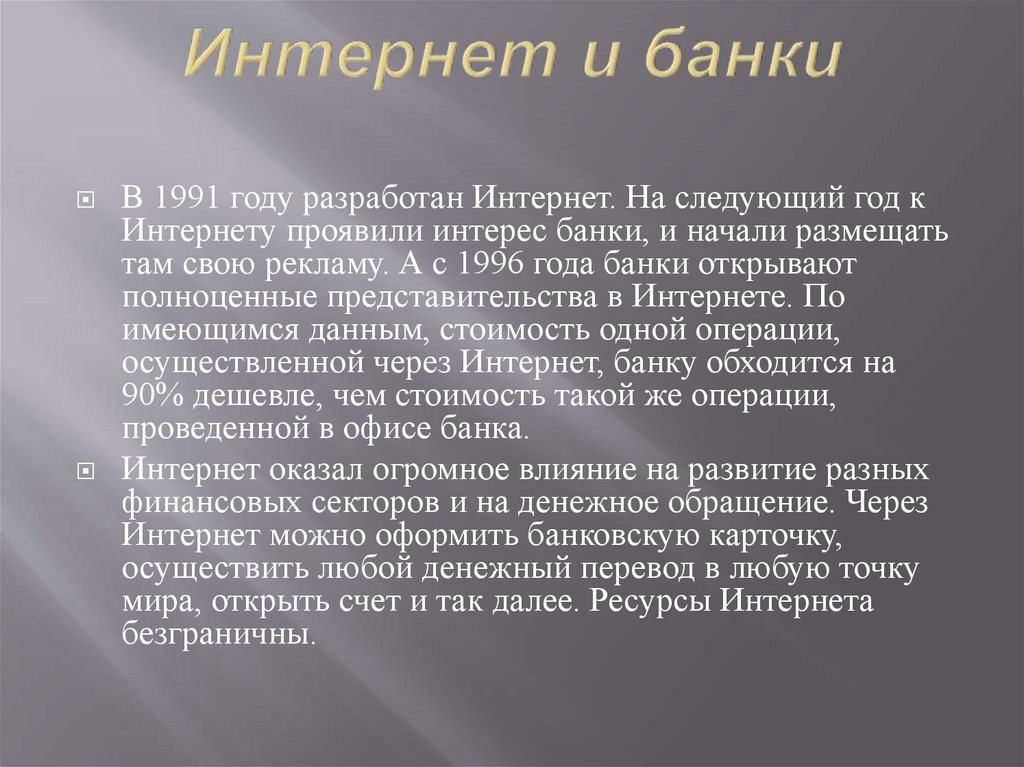 В 1991 году разработан Интернет. На следующий год кИнтернету проявили интерес банки, и начали размещать