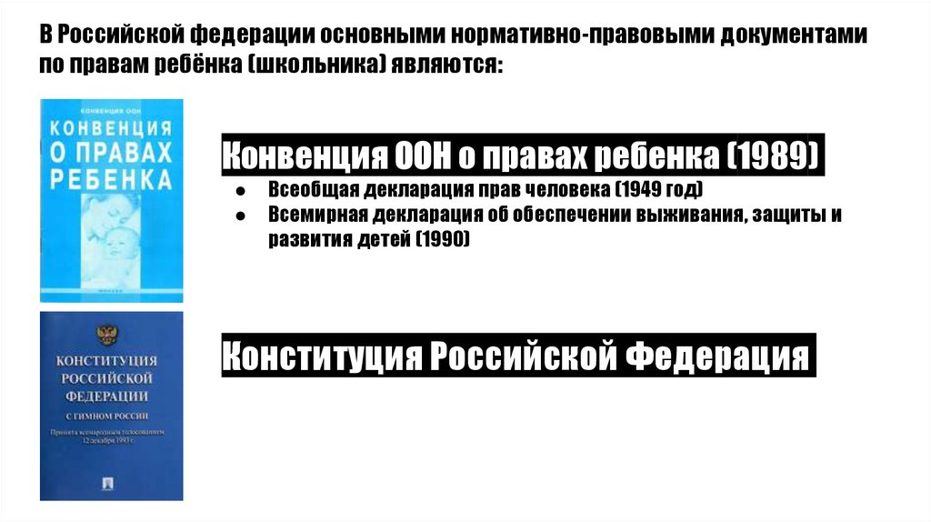 В Российской федерации основными нормативно-правовыми документамипо правам ребёнка (школьника) являются: