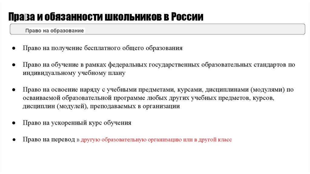 Права и обязанности школьников в РоссииПраво на образование