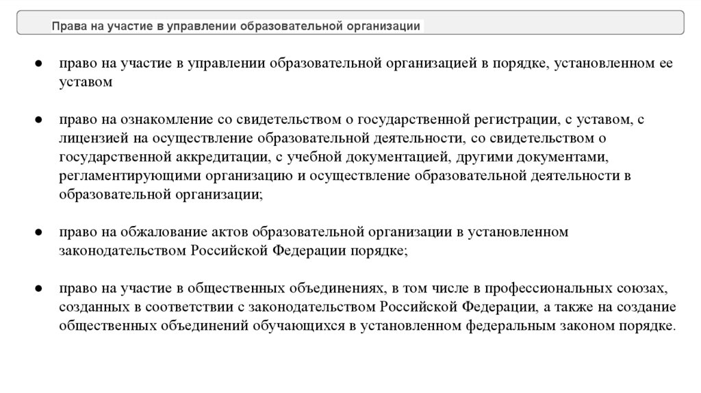 Права на участие в управлении образовательной организацииправо на участие в управлении образовательной организацией в порядке, установленном ее