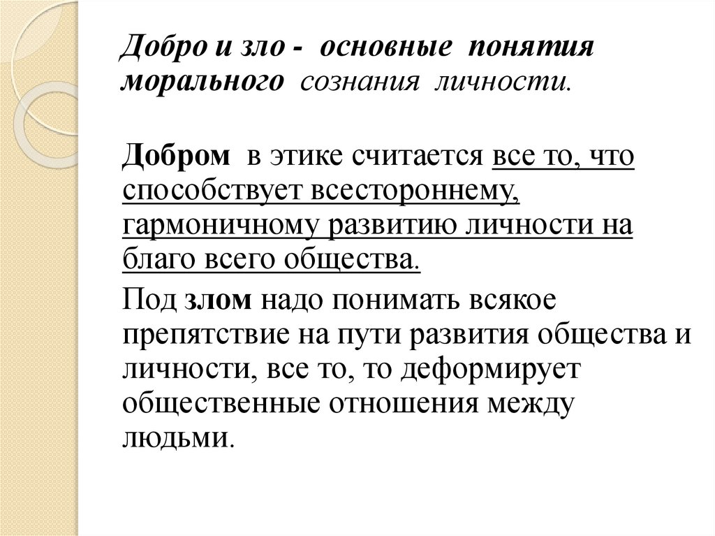 Добро и зло - основные понятияморального сознания личности.
