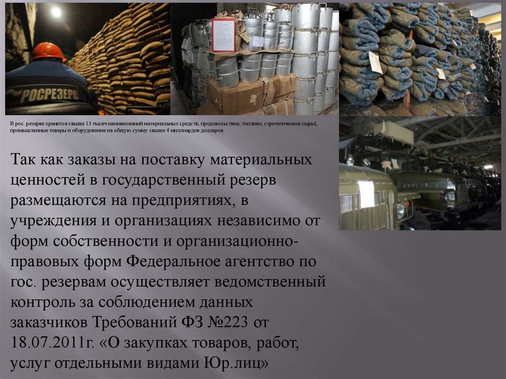 В рос. резерве хранится свыше 13 тысяч наименований материальных средств, продовольствие, топливо, стратегическое сырьё,промышленные товары и оборудование на общую сумму свыше 4 миллиардов долларов.