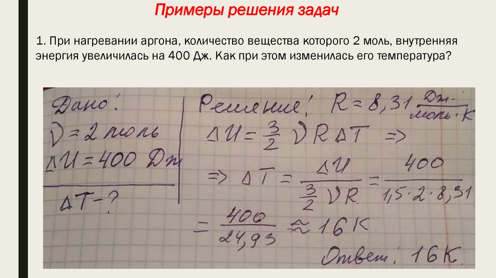Примеры решения задач1. При нагревании аргона, количество вещества которого 2 моль, внутренняя
