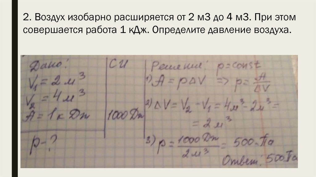 2. Воздух изобарно расширяется от 2 м3 до 4 м3. При этомсовершается работа 1 кДж. Определите давление воздуха.