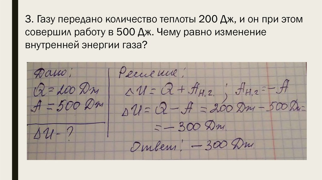 3. Газу передано количество теплоты 200 Дж, и он при этомсовершил работу в 500 Дж. Чему равно изменение