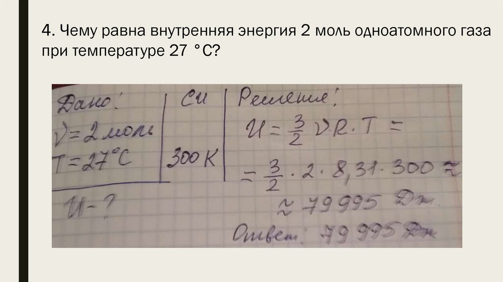 4. Чему равна внутренняя энергия 2 моль одноатомного газапри температуре 27 °С?