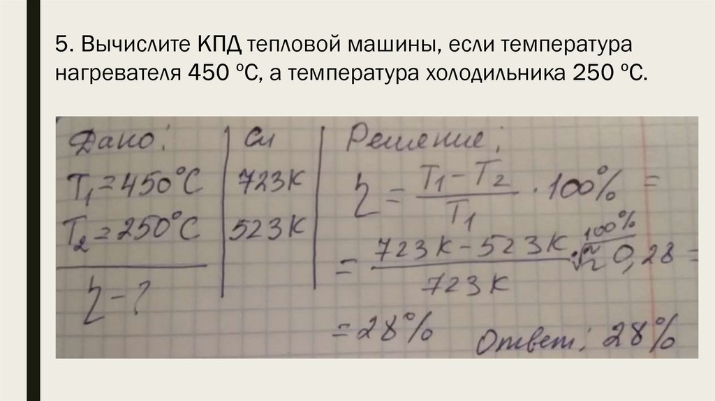 5. Вычислите КПД тепловой машины, если температуранагревателя 450 ºС, а температура холодильника 250 ºС.