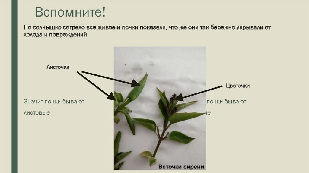 Вспомните!Но солнышко согрело все живое и почки показали, что же они так бережно укрывали от