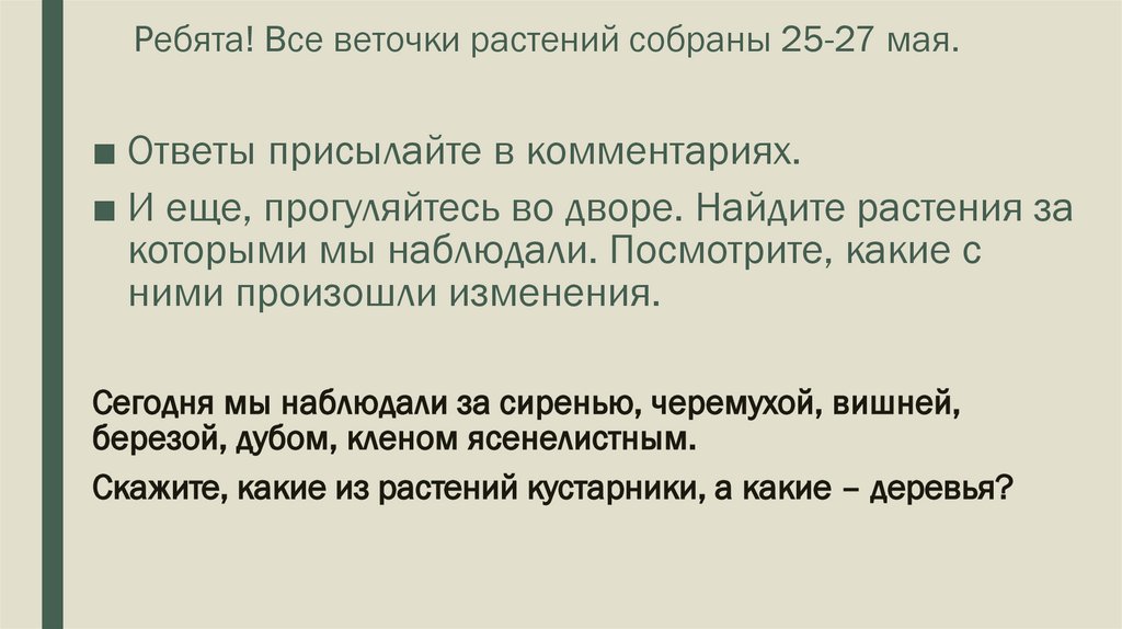 Ребята! Все веточки растений собраны 25-27 мая.■ Ответы присылайте в комментариях.