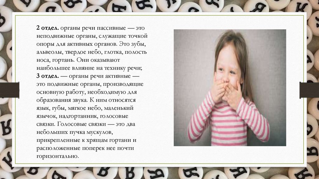 2 отдел. органы речи пассивные — этонеподвижные органы, служащие точкой