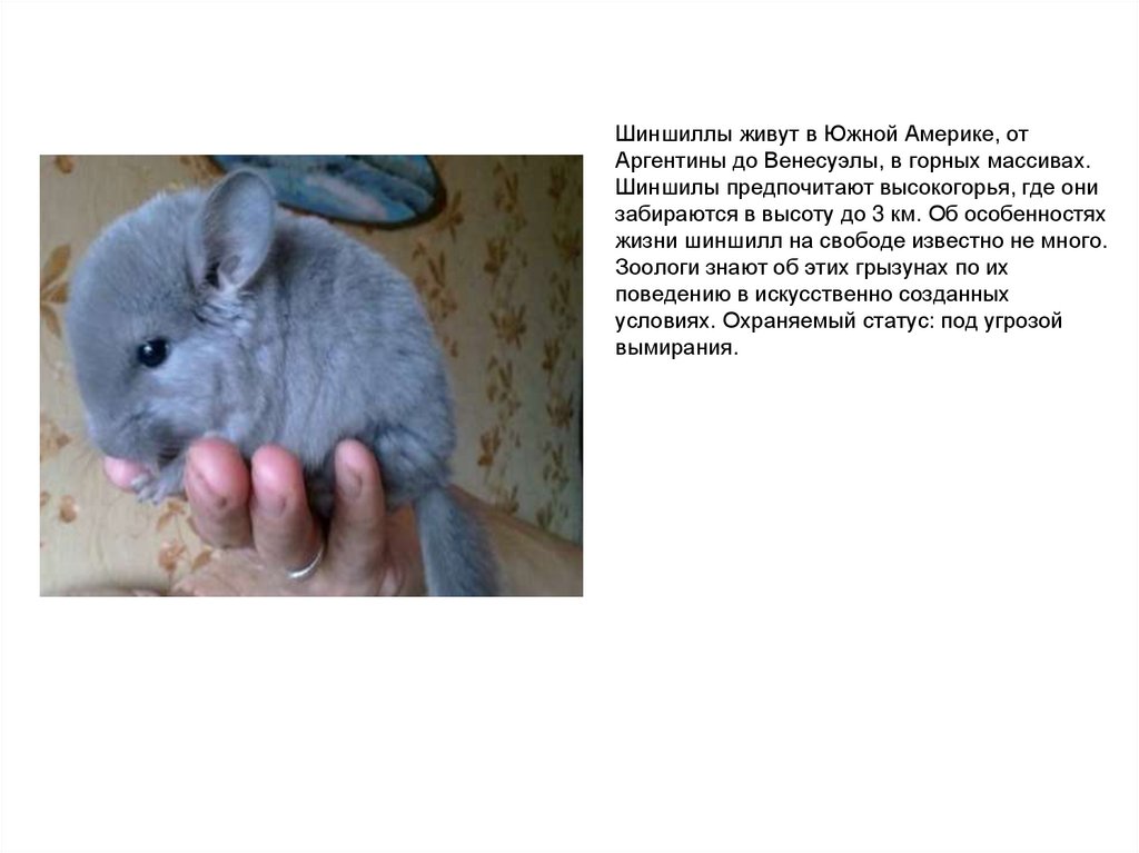 Шиншиллы живут в Южной Америке, отАргентины до Венесуэлы, в горных массивах.