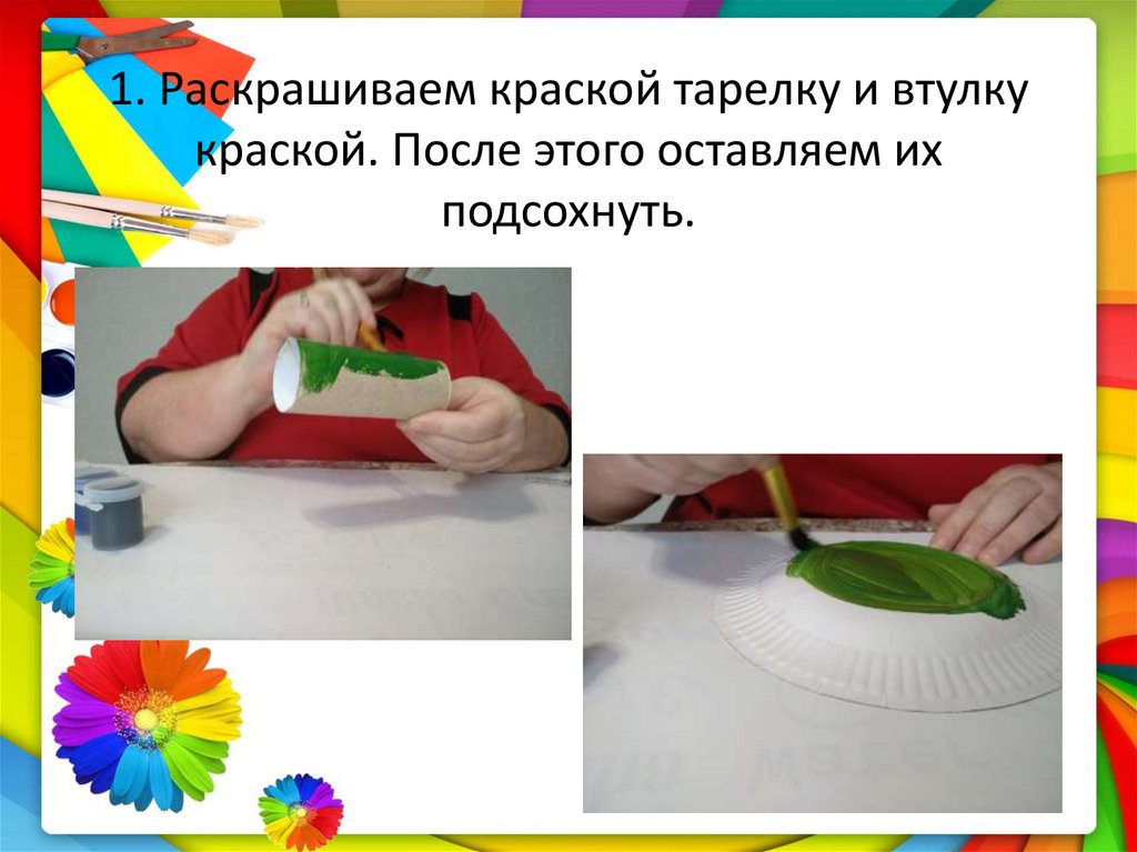 1. Раскрашиваем краской тарелку и втулкукраской. После этого оставляем их