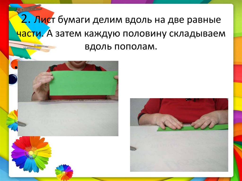 2. Лист бумаги делим вдоль на две равныечасти. А затем каждую половину складываем