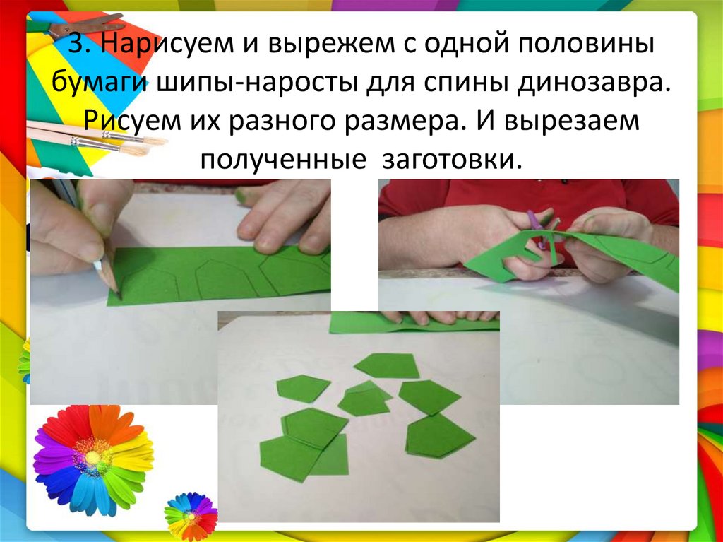 3. Нарисуем и вырежем с одной половиныбумаги шипы-наросты для спины динозавра.