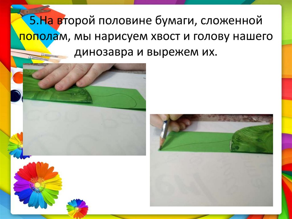 5.На второй половине бумаги, сложеннойпополам, мы нарисуем хвост и голову нашего