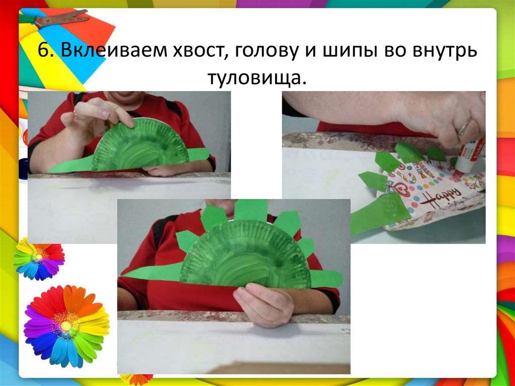6. Вклеиваем хвост, голову и шипы во внутрьтуловища.