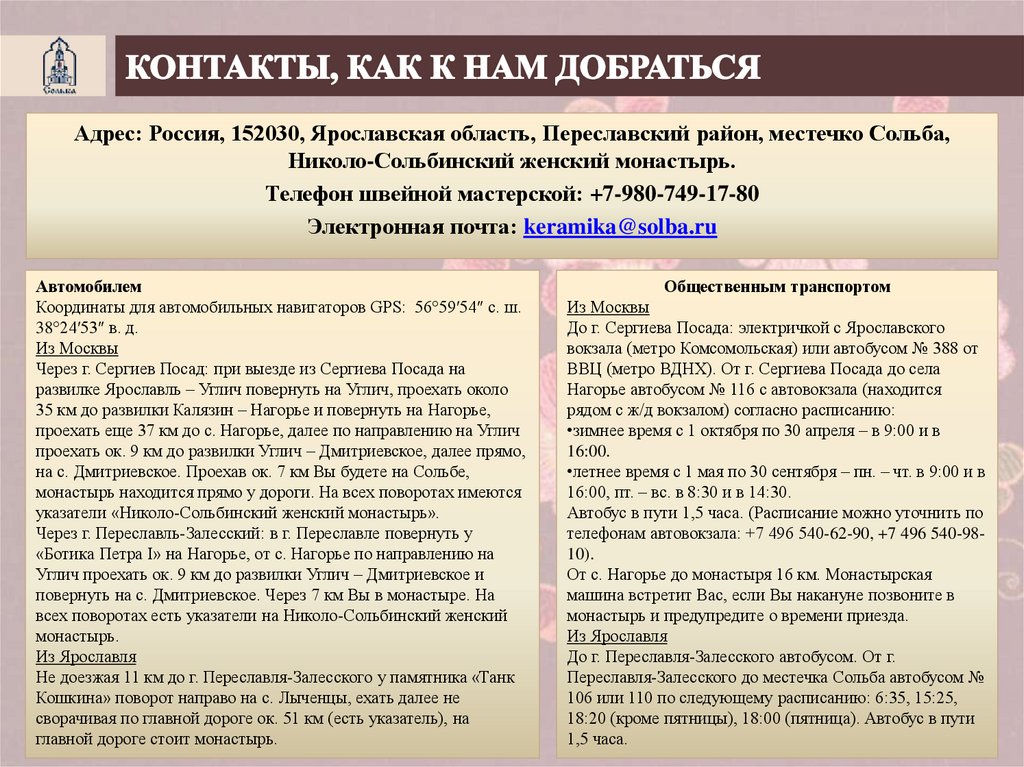 Адрес: Россия, 152030, Ярославская область, Переславский район, местечко Сольба,Николо-Сольбинский женский монастырь.