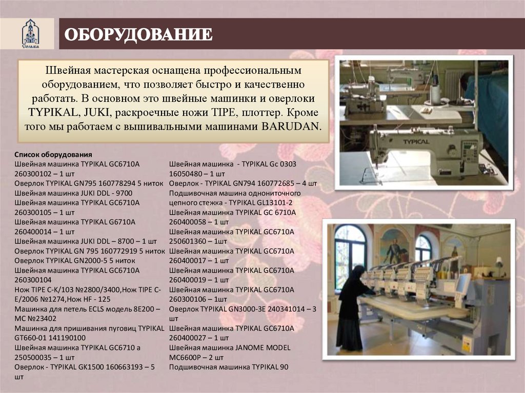 Швейная мастерская оснащена профессиональнымоборудованием, что позволяет быстро и качественно