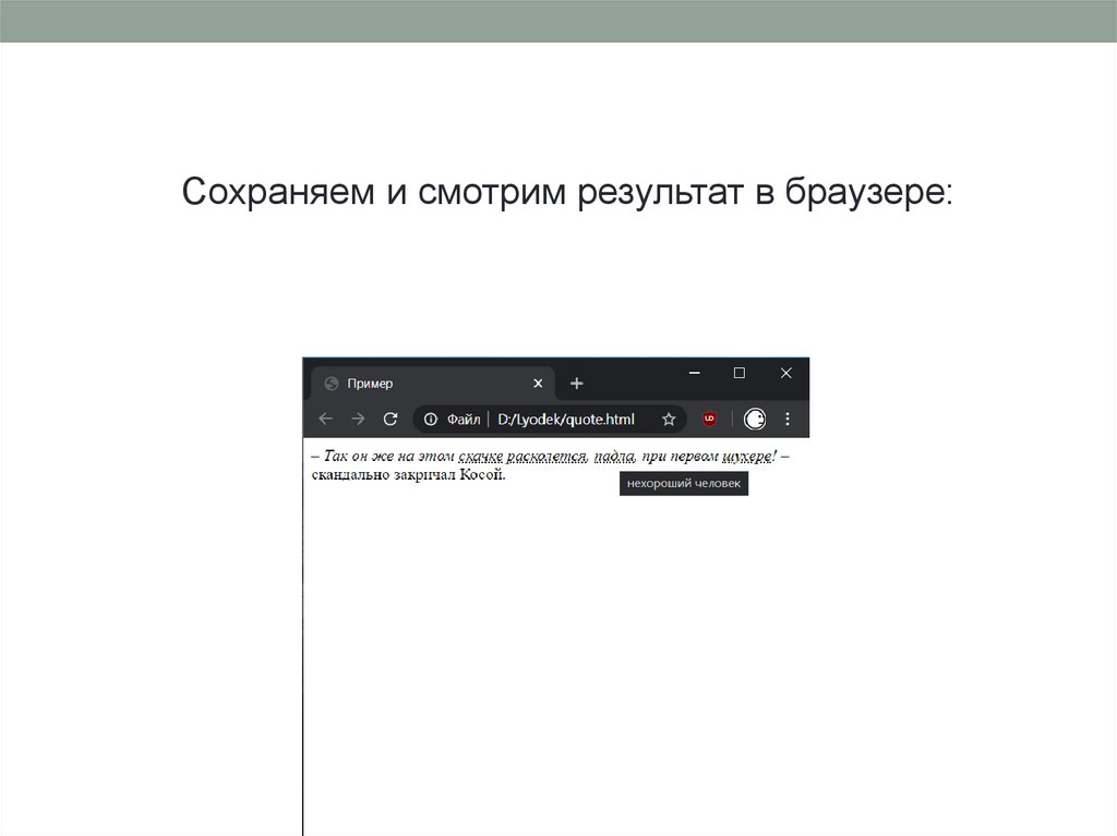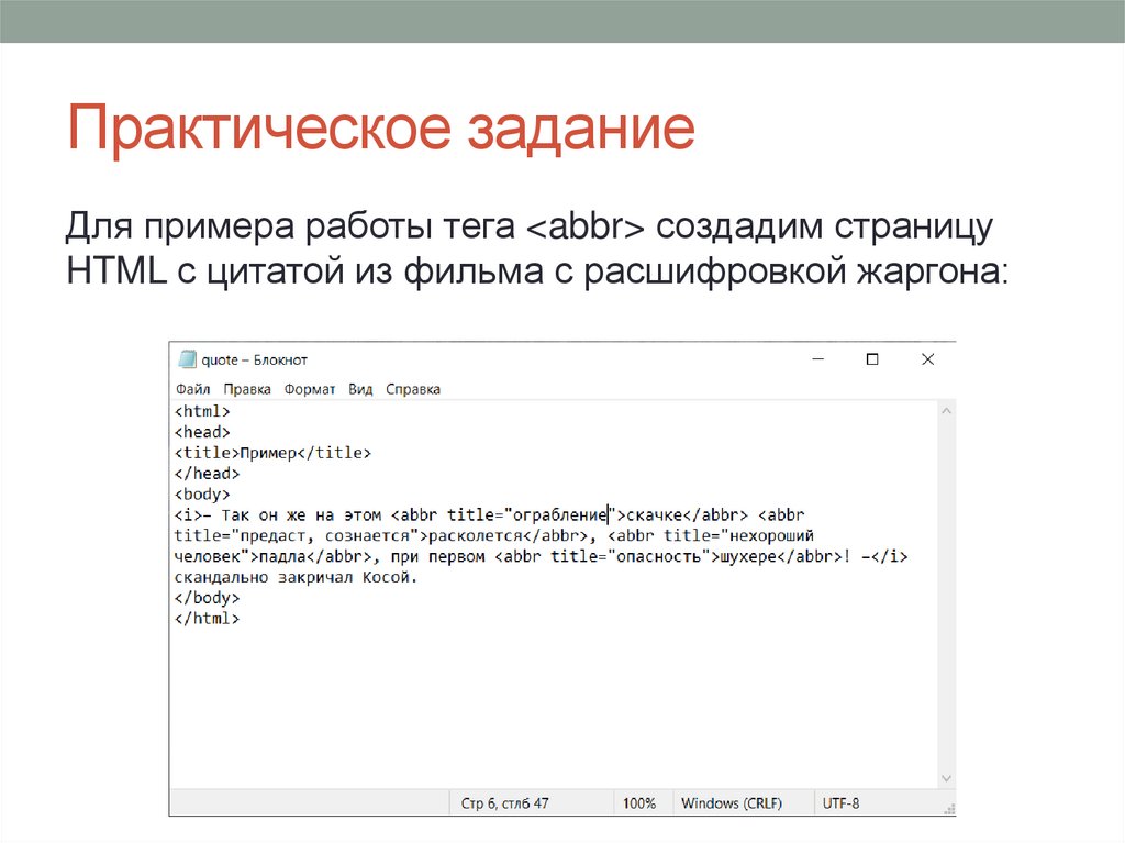 Практическое заданиеДля примера работы тега <abbr> создадим страницу