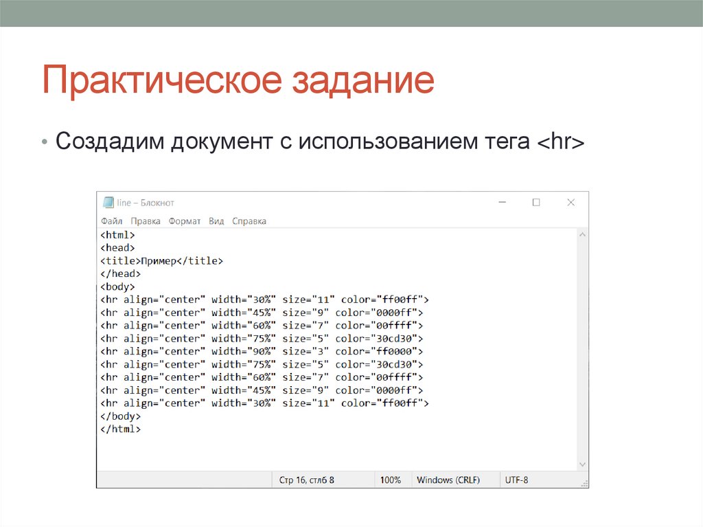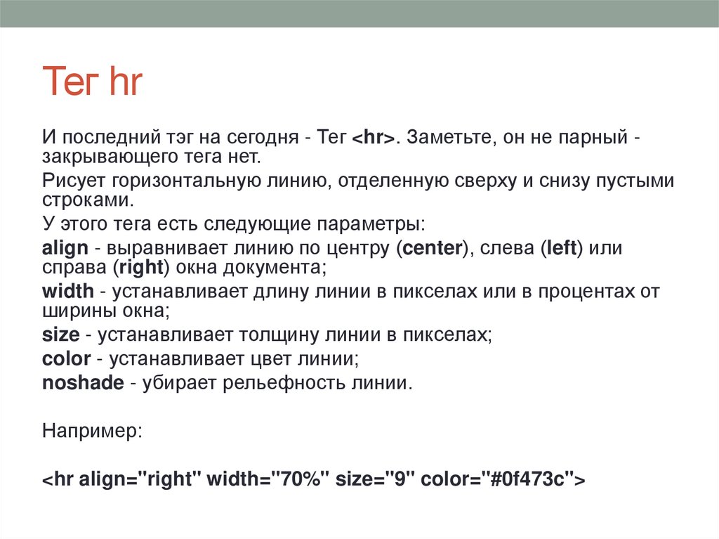 Тег hrИ последний тэг на сегодня - Тег <hr>. Заметьте, он не парный закрывающего тега нет.