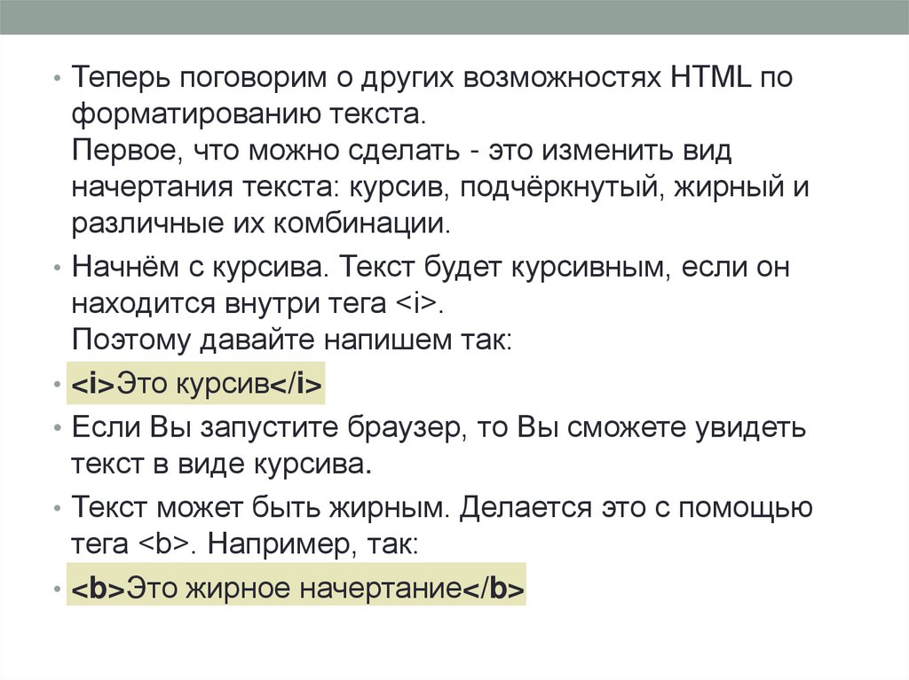 • Теперь поговорим о других возможностях HTML поформатированию текста.
