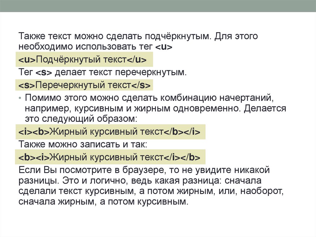 Также текст можно сделать подчёркнутым. Для этогонеобходимо использовать тег <u>