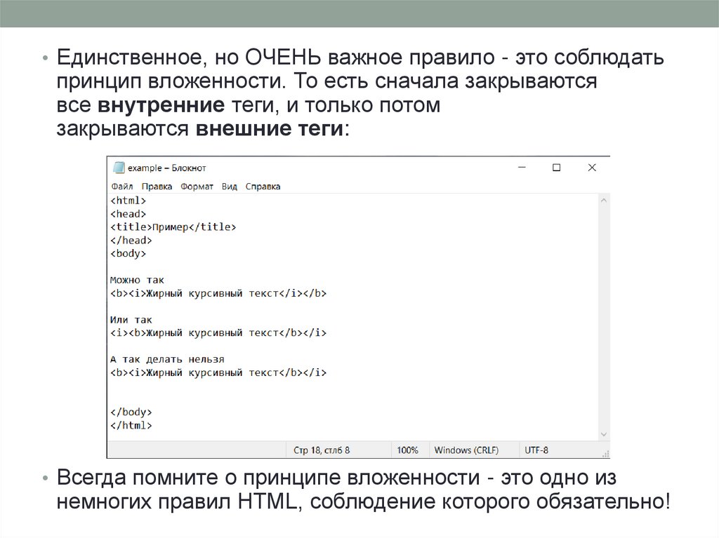 • Единственное, но ОЧЕНЬ важное правило - это соблюдатьпринцип вложенности. То есть сначала закрываются