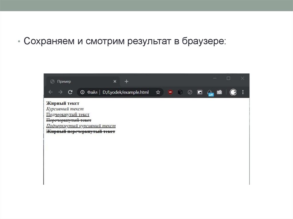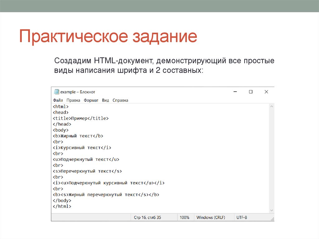 Практическое заданиеСоздадим HTML-документ, демонстрирующий все простые
