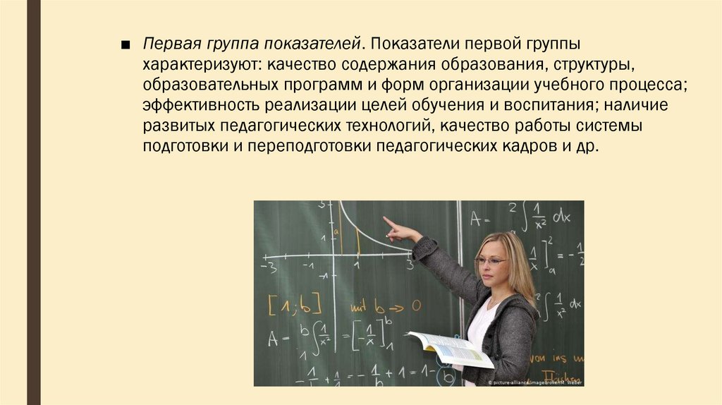 ■ Первая группа показателей. Показатели первой группыхарактеризуют: качество содержания образования, структуры,
