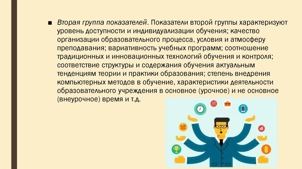 ■ Вторая группа показателей. Показатели второй группы характеризуютуровень доступности и индивидуализации обучения; качество