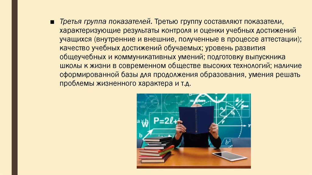 ■ Третья группа показателей. Третью группу составляют показатели,характеризующие результаты контроля и оценки учебных достижений