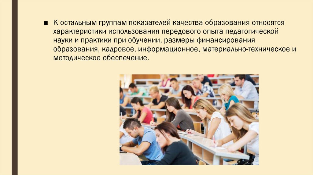 ■ К остальным группам показателей качества образования относятсяхарактеристики использования передового опыта педагогической