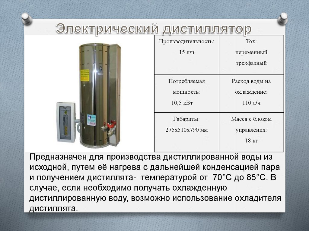 Предназначен для производства дистиллированной воды из